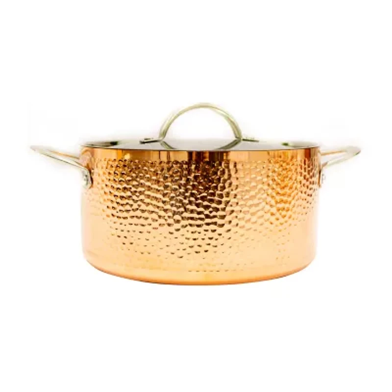 Vintage hammered tri-ply copper 9.5" stockpot 5.75qt. with lid, a timeless and elegant addition to any kitchen. Crafted with meticulous attention to detail, this stockpot showcases a beautiful hammered copper exterior that not only adds a touch of sophistication but also enhances heat conductivity for even cooking. The tri-ply construction consists of an aluminum core sandwiched between a layer of 18/10 stainless steel and copper exterior, ensuring excellent heat distribution and retention. This stockpot is the perfect size for preparing delicious meals for small to medium-sized gatherings. The included lid helps to seal in moisture and flavors, allowing you to achieve tender and succulent results every time. The vintage design of this stockpot adds a touch of nostalgia to your cooking experience, making it a conversation starter in any kitchen.
