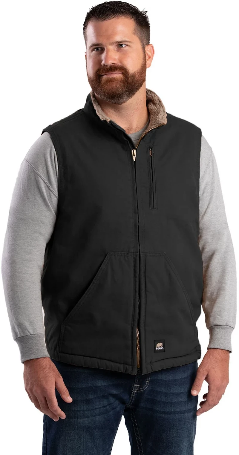 Layer up against the cold with a Berne Men's Heartland Sherpa-Lined Washed Duck Vest. The sanded duck exterior features triple stitch main seams for durability, and the Sherpa liner adds softness. Plenty of pockets provide convenient storage for tools and essentials.