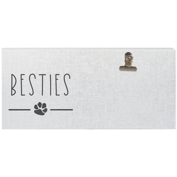Your pet is your best friend! That's why you'll love our Besties Clip Picture Frame. This picture frame is perfect for displaying your favorite picture of you and your furry friend! Plaque measures 12L x 0.75W x 5.5H in. Crafted of wood Gray background finish Reads "Besties" with a paw print Features a metal clip for displaying pictures Hues of black and gray Hand-crafted in the United States Weight: 1.25 lbs. Care: Dust with a soft, dry cloth. This item is available at Kirklands.com only, not available in stores. Please note: this item cannot be shipped to APO/FPO addresses.
