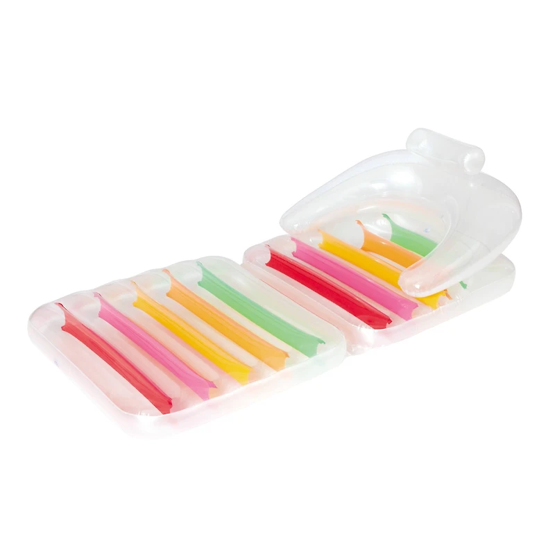 This new highly comfortable, inflatable lounge chair made with original Bestway quality. The integrated armrests and head cushion improve its comfort. The lounge chair can quickly be transformed into a armchair. Each High Fashion Folding Lounge Chair is approximately 79 inches x 35 inches. There are 3 air chambers and it has a transparent top with multi colored I-beam construction.Details:Multicolor6.5ft. x 35" overall size3 air chambersWeight capacity of 198 poundsRepair patch is includedFor ages 12 and up