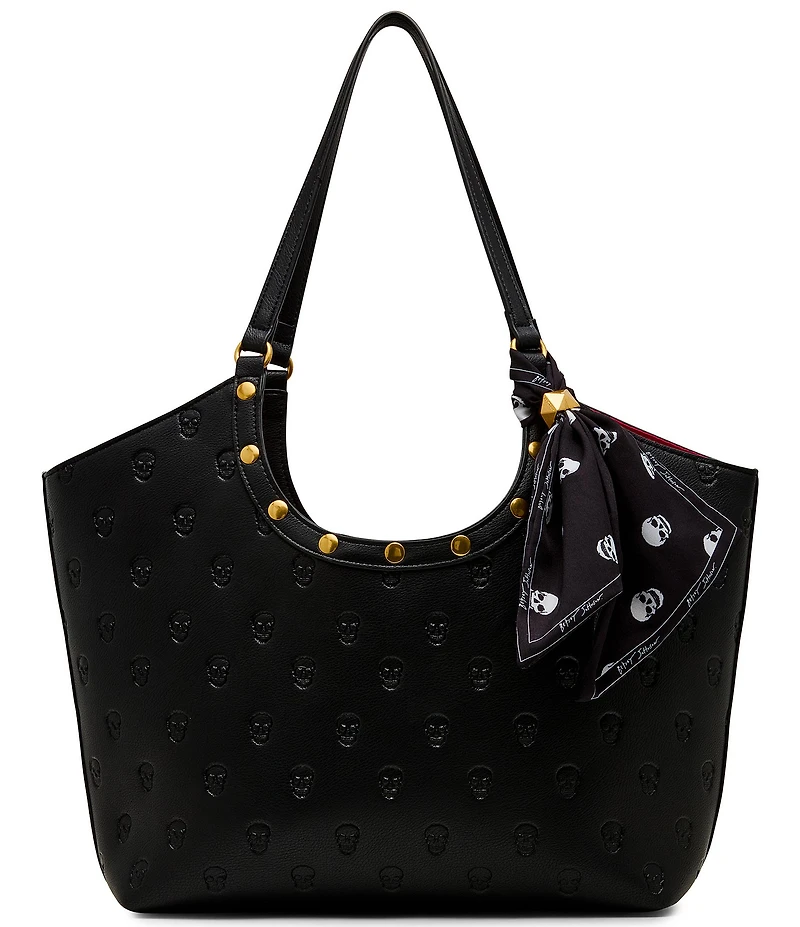 From Betsey Johnson, this handbag features: PU faux leather Magnetic closure Scarf detail Internal back wall zipper pocket Internal front wall slip pouch  Approx. 13" strap drop Approx. 19" L x 5" W x 10.5" H Imported.