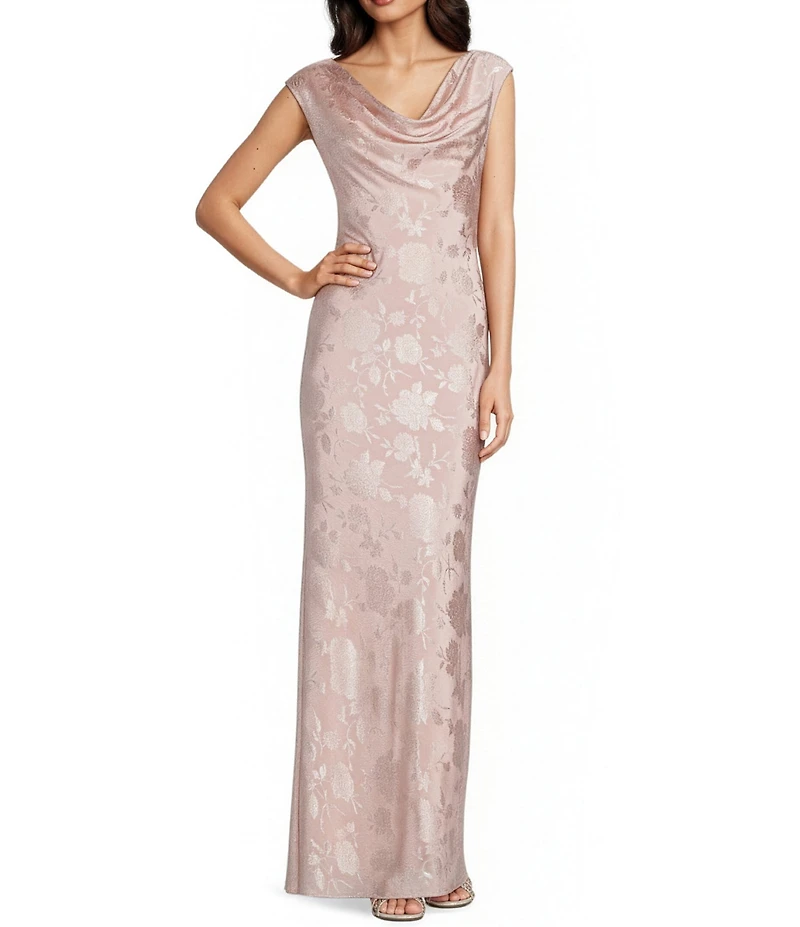 From Betsy & Adam, this dress features: Satin fabrication Sheath silhouette Cowl neckline Sleeveless Floral print Side zip closure Approx. 61" length Polyester Dry clean Imported.