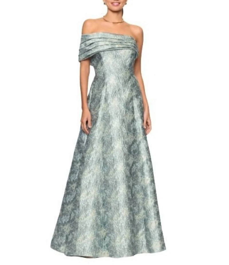 From Betsy & Adam, this dress features: Brocade fabrication A line gown silhouette One shoulder neckline One off the shoulder short sleeve Lined Zip back closure Approx. 61" length Polyester Hand wash cold Imported.