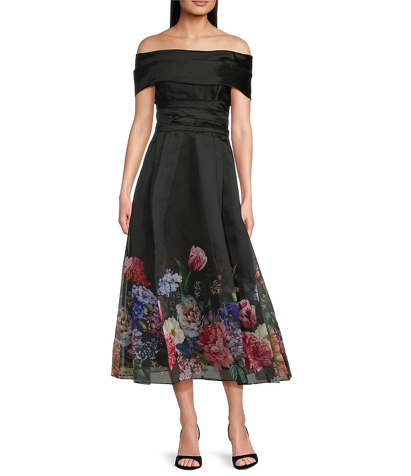 Betsy & Adam Organza Floral Print Off-The-Shoulder A-Line Midi Gown