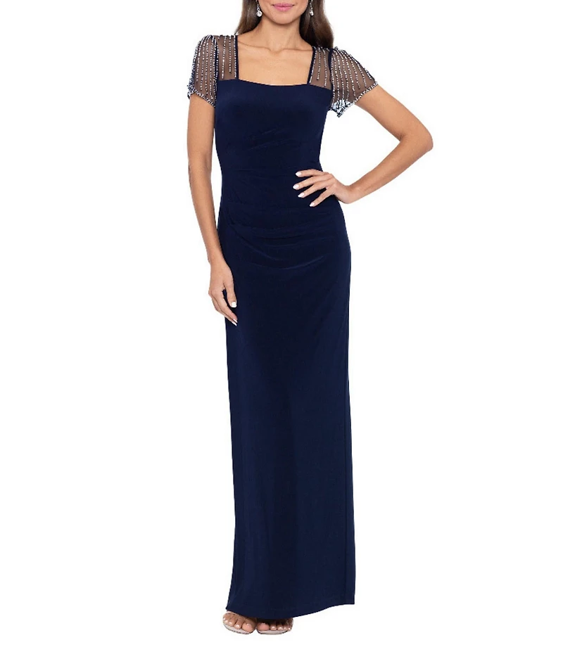 From Betsy & Adam Petite, this dress features: Jersey knit fabrication Square neckline Short sleeve Lined Beaded sleeves Open back Back slit Hidden back zipper closure Approx. 58" in length Polyester/spandex Spot clean Imported.