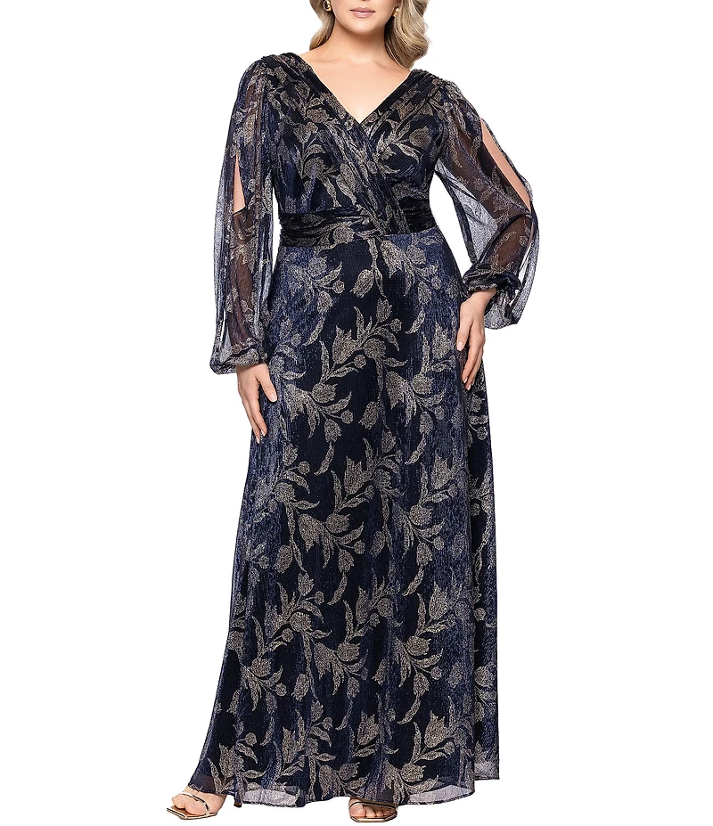 From Betsy & Adam Plus, this dress features: Metallic foil fabrication Surplice neckline Long sleeve Lined Sleeve cutouts Gathered waist Center back zipper closure Approx. 62" in length Polyester/metallic Spot clean Imported.