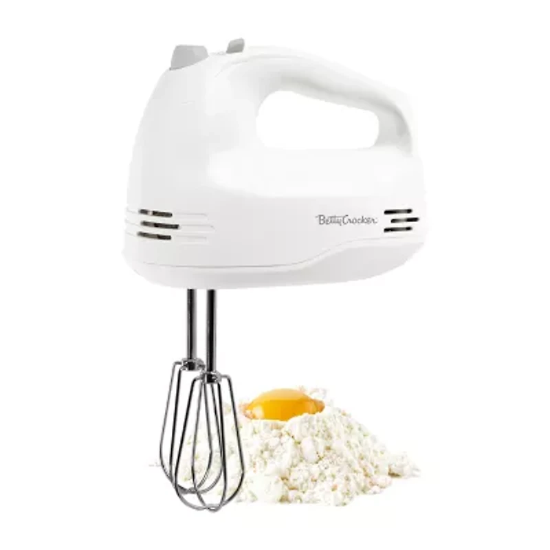 The Betty Crocker 5-Speed Hand Mixer. Whether you're whipping up fluffy pancakes, beating eggs or crafting delicious dough, this household essential is designed to make your culinary tasks a breeze. With its sleek, compact, and ergonomic design, this hand mixer is not only a powerful tool but also a stylish addition to your collection of kitchen appliances and gadgets. This hand mixer is equipped with a 5-speed control switch, allowing you to seamlessly transition between speeds for precise, perfect results every time. Powered by 150 watts, it's the ideal choice for those who appreciate efficiency and performance in their kitchen appliances. This mixer boasts an easy access beater eject button, making cleanup a snap after you're done creating culinary magic. 5-Speed Hand Mixer comes with easy to clean chrome plated beaters. These beaters are not only durable but also make mixing ingredients like a dream, whether you're working on a small batch of cookies or a larger cake mix. Plus, the heel rest offers stability when you need to set it down between tasks, ensuring your kitchen stays neat and tidy. For those who value comfort, the ergonomic handle ensures you can mix for extended periods without discomfort. Whether you're a novice baker or a seasoned chef, the Betty Crocker hand mixer is sure to become your go-to kitchen gadget.
