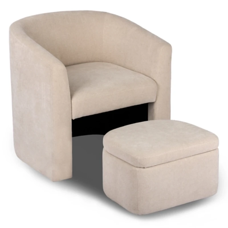 Elevate your space with this Bexley Natural Upholstered Chair & Ottoman Set! This stylish, functional, and versatile set features a compact design that offers comfort as well as convenience for any room. Set includes one (1) chair and one (1) ottoman Chair measures 29W x 25D x 29H in.; seat height: 18 in. Ottoman measures 19W x 17D x 12H in. Crafted with a wood frame Upholstered in neutral fabric and filled with high density foam Chair features a classic barrel silhouette Ottoman tucks underneath ottoman and features interior storage space Weight: 28 lbs. Weight capacity: 225 lbs. No assembly required Not intended for commercial use Care: Spot clean. Contact your local Kirkland's store for availability. Quantities and selection may vary by location.