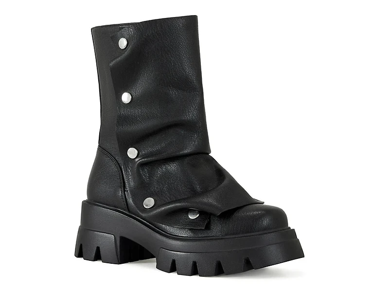 The Bharti bootie from Azalea Wang refreshes your cool weather looks with its chunky block heel, lugged sole, and decorative buttons. Thew slouchy shaft pairs perfectly with skirts, tights, and everything in between.
