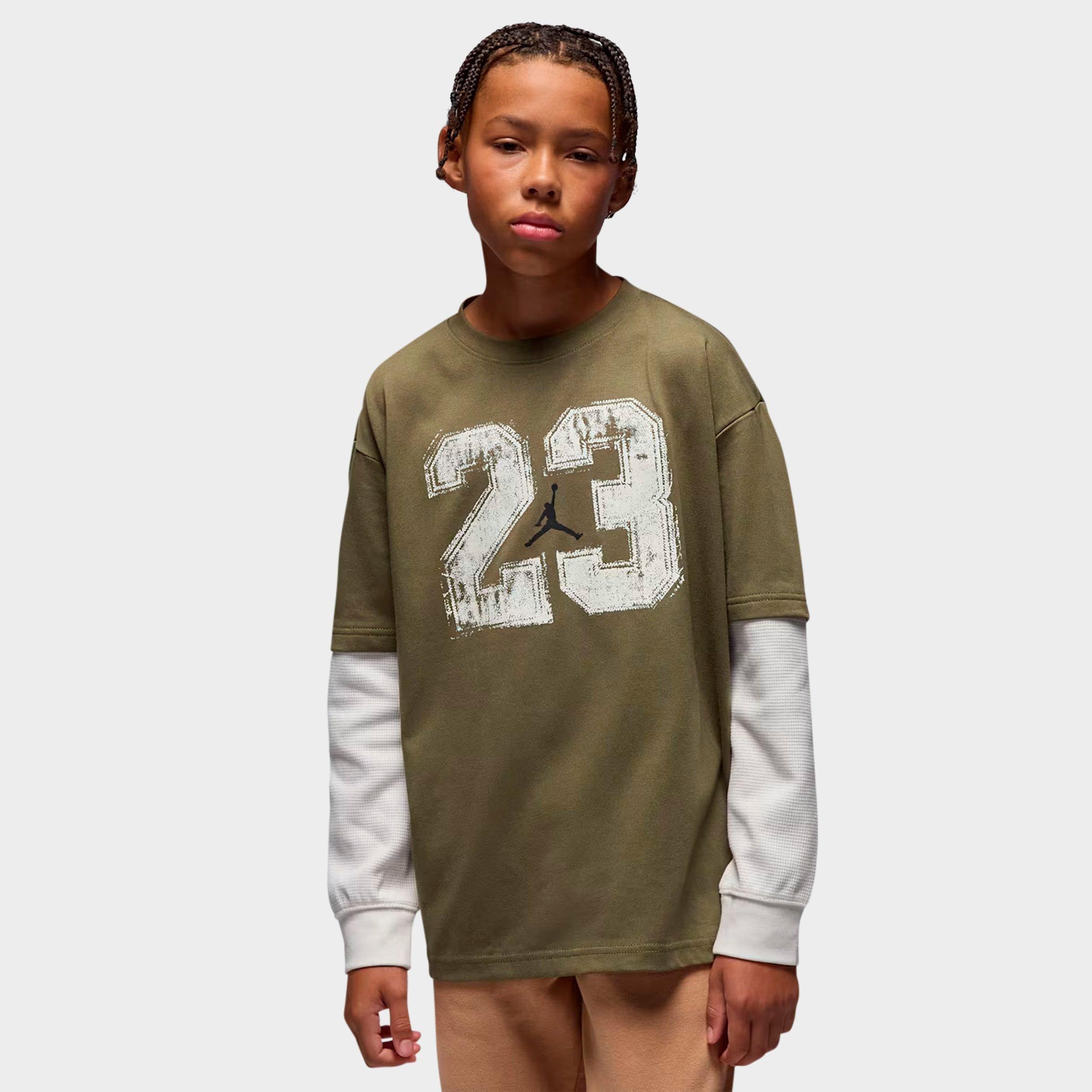 Layer up for chilly weather with the Big Kids' Jordan 23 Long-Sleeve T-Shirt. This two-in-one shirt looks like a short-sleeve tee over a long-sleeve shirt, but it's actually one shirt!