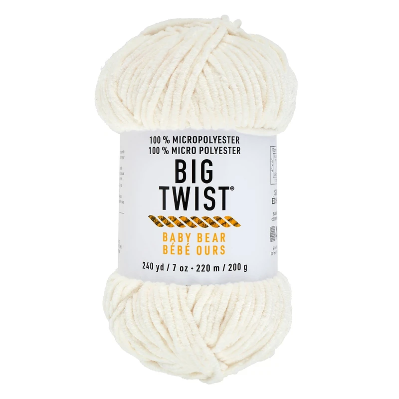 Big Twist's Baby Bear yarn is perfect for creating cuddly soft knit and crochet crafts. This super bulky polyester chenille yarn will be your go-to for making plush blankets, scarves, hats and more.We understand the importance of dye lots and will try to match dye lots for your order, however, we cannot guarantee all skeins will be the same dye lot.This is the same great Big Twist Product you know and love. Please Note: Due to packaging transitions, the label on the product you receive may occasionally display the name "Loops & Threads Cozy Cub." Rest assured, this is the exact same high-quality product with the same specifications from the same mill, regardless of the name on the label.Weight: Super Bulky (6)Contents: 100% polyesterSkein Weight: 7 oz. / 200 gYardage: 241 yd. / 220 mKnitting Gauge: 11 sts - 11 rows = 4" (10 cm)Crochet Gauge: 10sc - 10 rows = 4" (10 cm)Suggested Knitting Needle: 6.5 mm, US - 10.5Suggested Crochet Hook: 6.5 mm, US - K/10.5