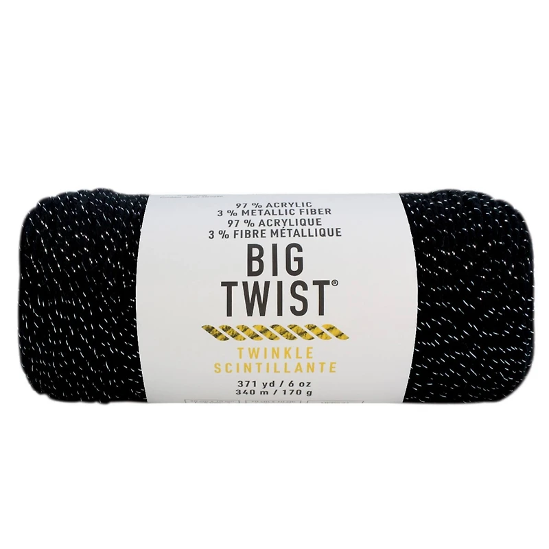 Big Twist Twinkle Yarn is a worsted acrylic blend yarn for a wide array of accessory and décor projects that you just have to make. With the perfect blend of sparkle and strength for easy washability, this soft, easy-to-knit yarn is perfect for comfy sweaters, throw blankets you'll want to curl up in, cardigans for kids and adults and so much more!We understand the importance of dye lots and will try to match dye lots for your order, however, we cannot guarantee all skeins will be the same dye lot.Weight: Medium (4)Contents: 97% acrylic, 3% metallic fiberSkein Weight: 6 oz. / 170 gYardage: 371 yd. / 340 mKnitting Gauge:14 sts - 19 rows = 4" (10 cm)Crochet Gauge:13 sc - 15 rows = 4" (10 cm)Suggested Knitting Needle:5 mm, US - 8Suggested Crochet Hook:5 mm, US - H/8