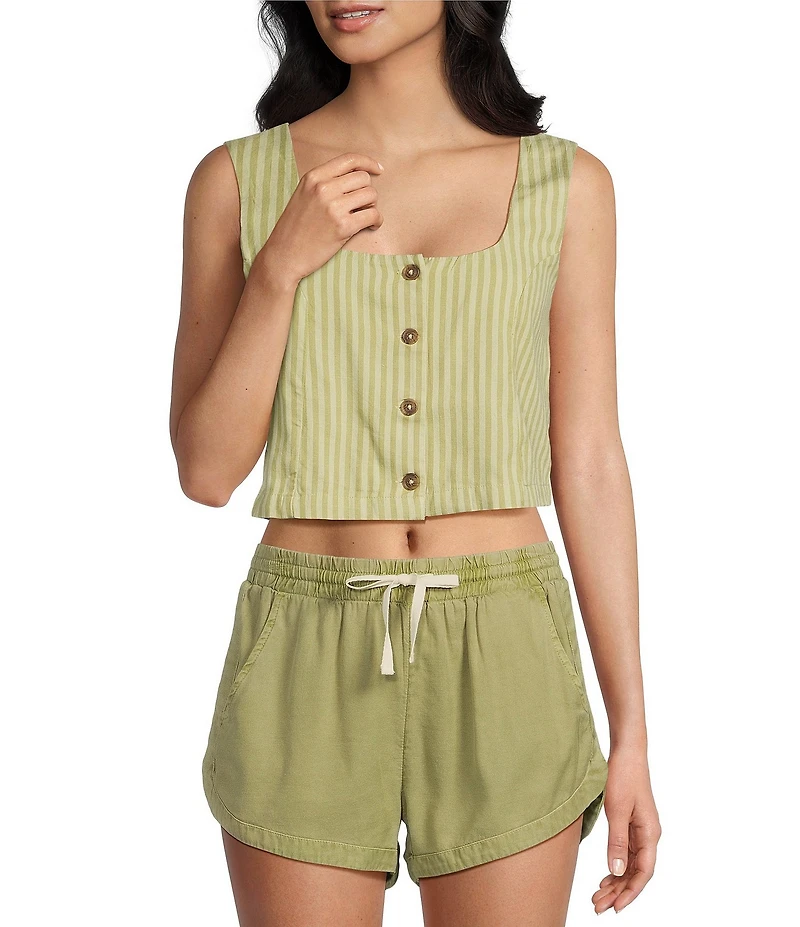 From Billabong, this tank features: Square neckline Sleeveless Stripe print Button front closure Cotton/viscose Machine wash/tumble dry Imported.