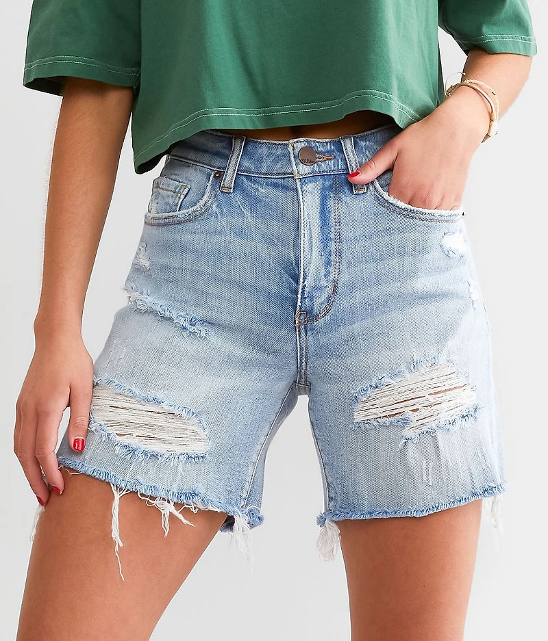 High rise Slim through the hip and thigh 4 1/2" midi short Destruction and frayed hem details