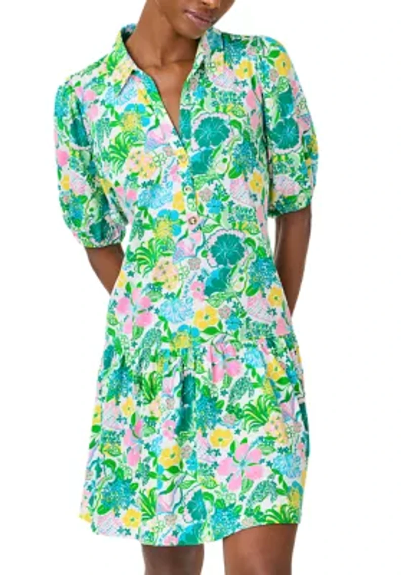 This easy-fit popover shirtdress features a classic collar and gold buttons along the placket. Designed to skim the body for a relaxed, roomier silhouette, it is crafted from 100% Supima® cotton jersey for an ultra-soft feel. Button closure Collar Elbow puff sleeves Imported Product Specifications 35.5" L Material & Care 100% cotton Machine washable