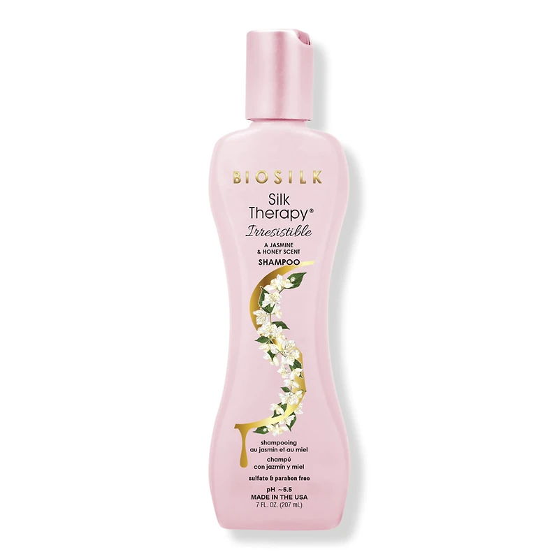 IRRESISTIBLE SILK THERAPY SHAMPOO 7OZ. Benefits: Cleanses the hair and removes build up. Silk proteins strengthen the hair and provide more body and volume. Silk improves elasticity that can hold moisture up to 3 times its own weight. Provides Shine and tames frizz. Scent Type: Sheer Jasmine petals with sweet Honey and notes of Dewberry, Vanilla, Patchouli and Pink Rose. Leaves your hair smelling irresistible.. Formulated Without: Sulfate. Paraben. Gluten.