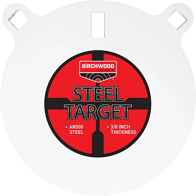 Practice your aim with the Birchwood Casey AR500 3/8 in. Round Steel Target 8 in.. It is intended for 8 or 10-inch centerfire rifles and handguns. The 3/8-inch NM500 steel construction enhances durability, and its white powder-coat offers better shot visibility. The double hang hole secures the target.