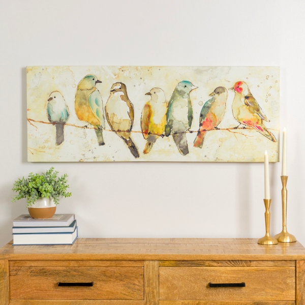 Our Birds on Wire Canvas Art Print will make a lovely presence in your dining room. Made with earthy, delicate watercolors, it's sure to bring natural charm into your home. Art measures 48L x 1.5W x 18H in. Distinctively printed on stretched canvas Wrapped edges complete the look Features birds subject Hues of tan, brown, yellow, blue, red, and gray Weight: 7.5 lbs. Hangs from back-mounted hardware Care: Dust with a soft, dry cloth. Contact your local Kirkland's store for availability. Quantities and selection may vary by location.