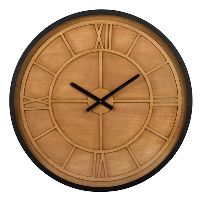 Add some variety to your wall decor with this Black and Brown Wooden Wall Clock. Its smooth finish and modern farmhouse charm, will transform your space in a snap! Clock measures 2.25W x 30 in. in diameter Crafted of wood, glass, and metal Black frame finish Brown clock face Black hands and brown Roman numerals Requires one (1) AA battery; battery not included Hangs from back-mounted hardware Care: Dust with a soft, dry cloth. Contact your local Kirkland's store for availability. Quantities and selection may vary by location. WARNING: Cancer and Reproductive Harm - For more information go to www.P65Warnings.ca.gov .