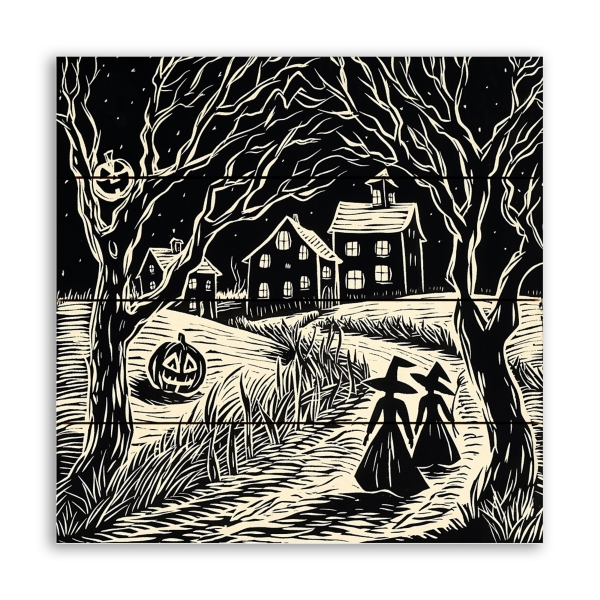 Step into a world of eerie enchantment with this Black and White Halloween Scene Pallet Wood Art! This plaque showcases a haunting scene surrounded by twisted, leafless trees and jack o lanterns. Art measures 11.75W x 0.75D x 11.75H in. Crafted of wood Printed on whitewashed Baltic Birch plywood Slatted pallet wood design Features a classic Halloween scene Hues of black and white Weight: 1.6 lbs. Designed and printed in the USA Includes a sawtooth hanger Care: Dust with a soft, dry cloth. This item is available at Kirklands.com only, not available in stores. Please note: this item cannot be shipped to APO/FPO addresses.