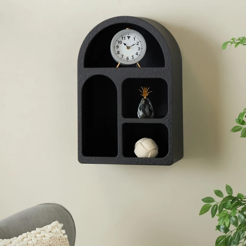Open the floor space in your child's playroom with our Black Arched Cubby Wall Shelf! It's perfect for providing extra storage with a sleek, modern style. Cabinet measures 15.75L x 8.1W x 23.6H in. Crafted of wood Includes four (4) open shelves Arched design Black finish Hangs from back-mounted hardware Weight: 10.62 lbs. Care: Dust with a soft, dry cloth. This item is available at Kirklands.com only, not available in stores. Please note: this item cannot be shipped to APO/FPO addresses. WARNING: Cancer and Reproductive Harm - For more information go to www.P65Warnings.ca.gov .