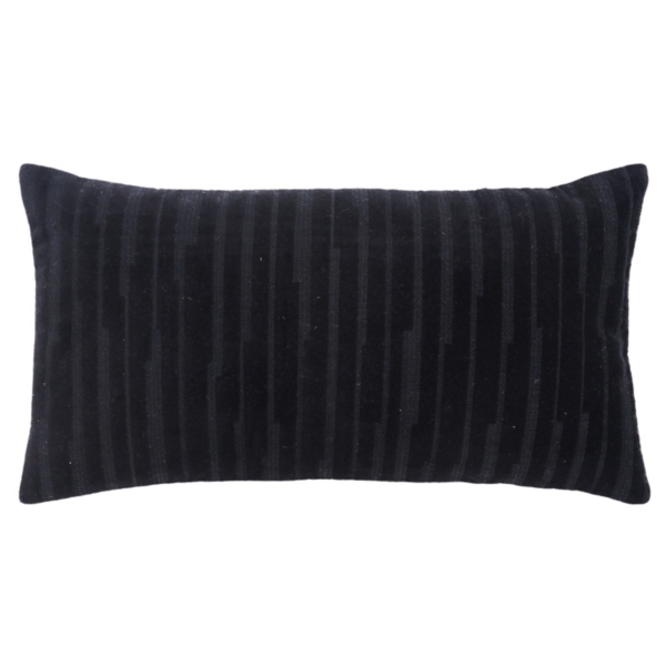 Add luxurious texture and pattern to your home with our Black Asymmetrical Stripe Lumbar Pillow! The asymmetrical velvet stripes make this pillow the perfect accent piece to elevate your living room or bedroom. Pillow measures 26L x 14H in. Crafted of cotton with polyester fill Features embroidered velvet asymmetrical vertical stripe pattern Solid black reverse Hues of black Hidden zipper closure Care: Spot clean. This item is available at Kirklands.com only, not available in stores. Please note: this item cannot be shipped to APO/FPO addresses.