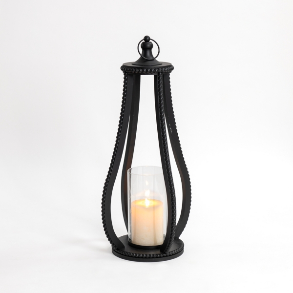 Refresh your front porch or living space with our Black Beaded Fieldstone Lantern! This lantern features a modern black finish with stylish beaded accents. You’ll love how the unique curved design brings dimension and shape to your home. Lantern measures 28.5H x 12.75 in. in diameter Crafted of engineered wood, metal, resin, and glass Black finish Features a curved design Accented with beaded details Decorative hook Lantern accommodates one (1) 3x6 pillar candle; candle not included Care: Dust with a soft, dry cloth. Safe for covered porch use. Contact your local Kirkland’s store for availability. Quantities and selection may vary by location.