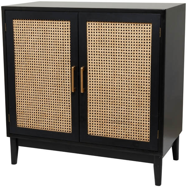 The shelving space in our stylish Black Rattan 2-Door Cabinet provides organization to store knick knacks, shoes, or mail in your entryway or living room. Cabinet stand measures 36L x 18W x 36H in. Crafted of wood composite Black frame and leg finish Features two (2) doors and one (1) interior shelf Doors feature a natural wood finish with woven cane detailing Satin gold accent pulls No assembly required Not intended for commercial use Care: Dust with a soft, dry cloth. This item is available at Kirklands.com only, not available in stores. Please note: this item cannot be shipped to APO/FPO addresses. WARNING: This product can expose you to chemicals including formaldehyde and phthalates, which is known to the state of California to cause cancer and birth defects or other reproductive harm. For more information go to www.P65Warnings.ca.gov .