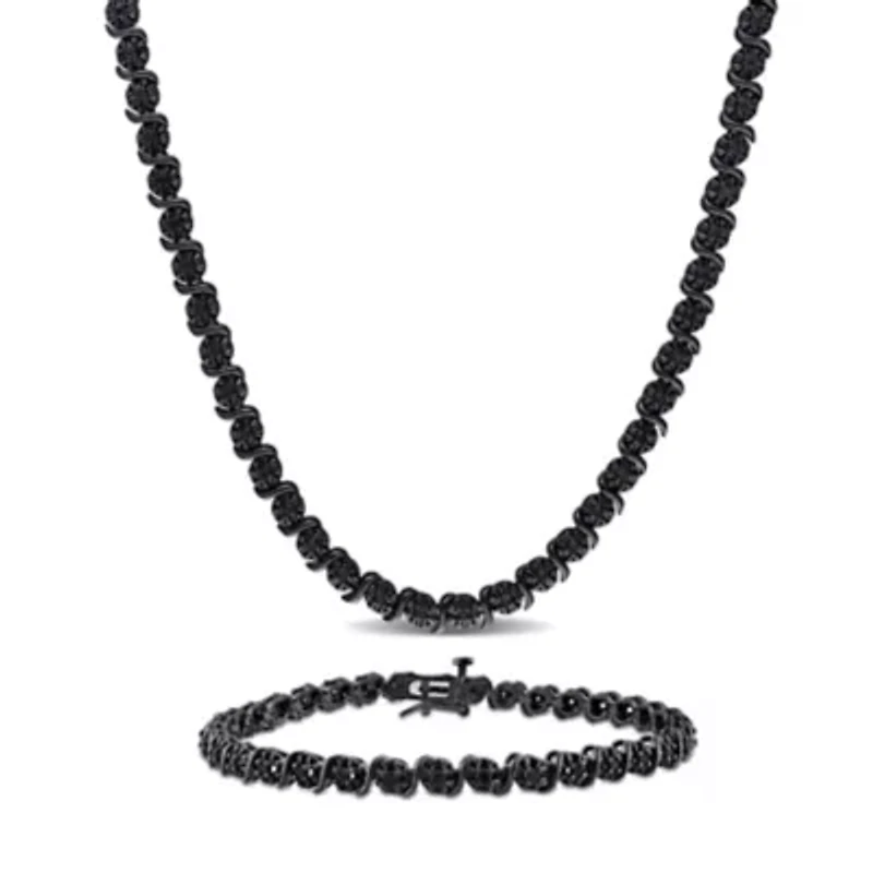 Make a bold and sophisticated statement with this striking tennis bracelet and necklace set. Crafted in sterling silver with black rhodium plating, it offers a sleek, modern look with a dramatic edge. The black diamond accents create a deep, captivating sparkle that stands out with refined elegance. Designed as a coordinated set, it brings effortless harmony and style to any look. A powerful combination of confidence, luxury, and contemporary appeal. 2 Box clasp Polished finish Prong setting Warranty available, 60 days Thailand Imported Product Specifications 7.25" & 17" Material & Care Sterling Silver Metal, Sterling silver Clean with a soft cloth.