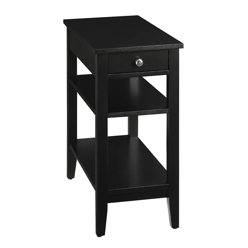 With a sturdy construction and a classically simple design, this Black Double Shelf Wood Accent Table will be the perfect addition to your living room or bedroom. Plus, with two shelves and a drawer, it provides ample storage space! Table measures 11.25L x 23.5W x 24H in. Crafted of solid wood and manufactured wood with non-lead based paint Black finish Features one (1) drawer and two (2) shelves Nickel drawer handle finish Weight: 20 Shelf weight capacity: 20 lbs. Assembly required Not intended for commercial use Care: Dust with a soft, dry cloth. This item is available at Kirklands.com only, not available in stores. Please note: this item cannot be shipped to APO/FPO addresses.