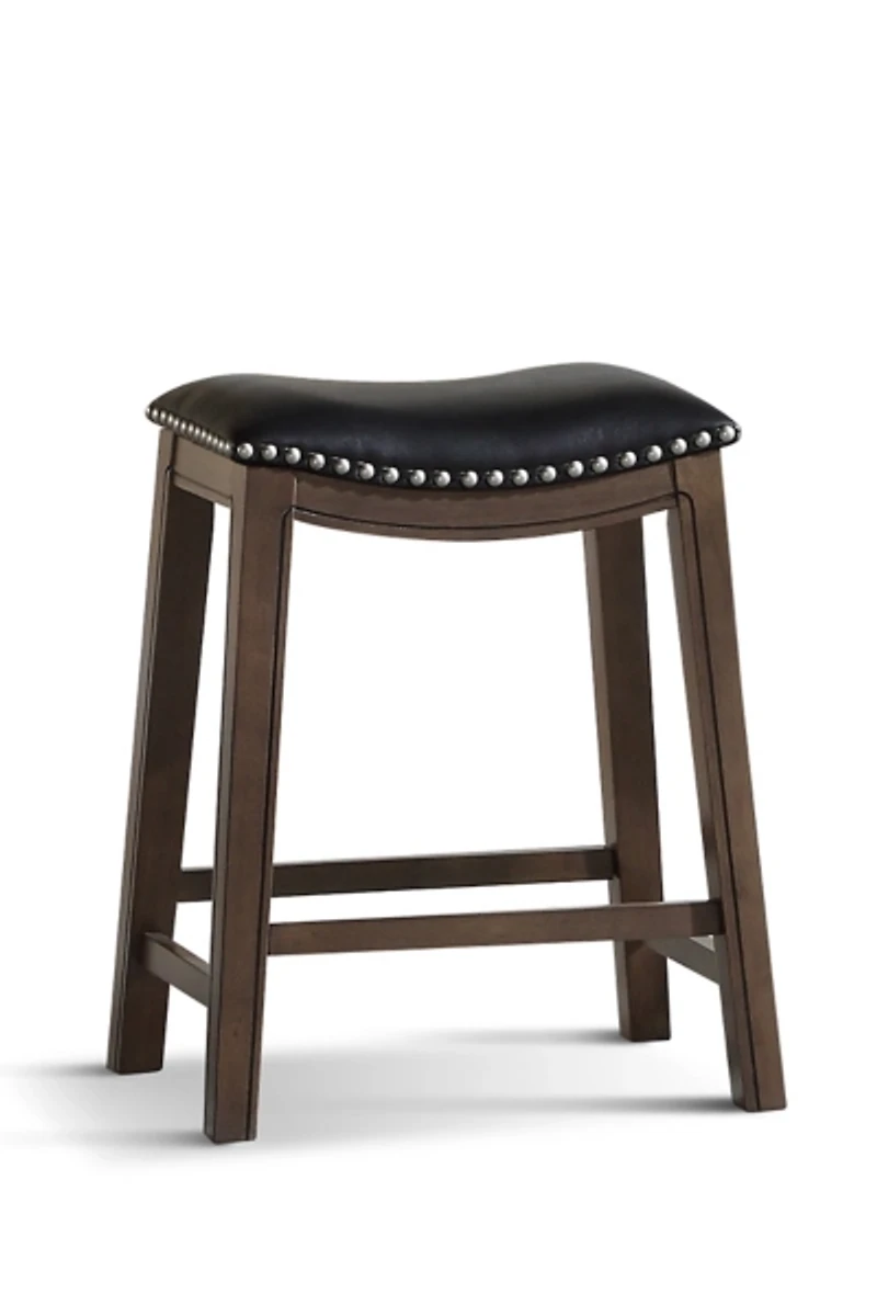 Give the perfect touch to any space with our Black Ella Saddle Counter Stool with Nailhead Trim. Its stylish nail head trim makes it a prominent accent for any kitchen. Stool measures 21L x 18W x 24H in. Frame crafted of wood Dark brown wood base finish Seat upholstered in black bonded leather Seat features silver nail head trim Holds up to 250 lbs. Assembly required Not intended for commercial use Care: Dust with a soft, dry cloth. This item is available at Kirklands.com only, not available in stores. Please note: this item cannot be shipped to APO/FPO addresses.