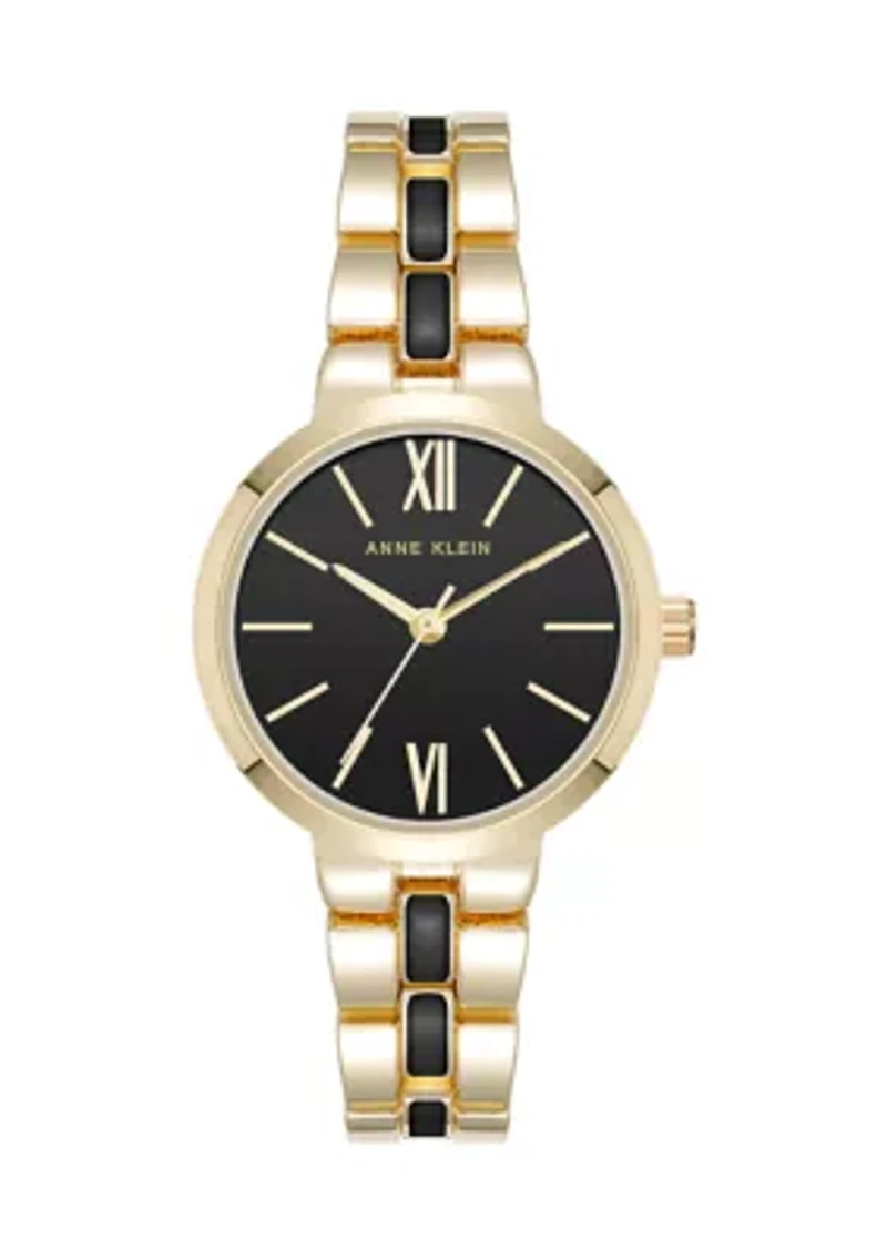 Elevate everyday style with this versatile timepiece from Anne Klein. With enamel center links, this watch is a perfect blend of sophistication and simplicity. Foldover clasp Analog dial Imported Material & Care Gold-tone metal Clean with a soft cloth