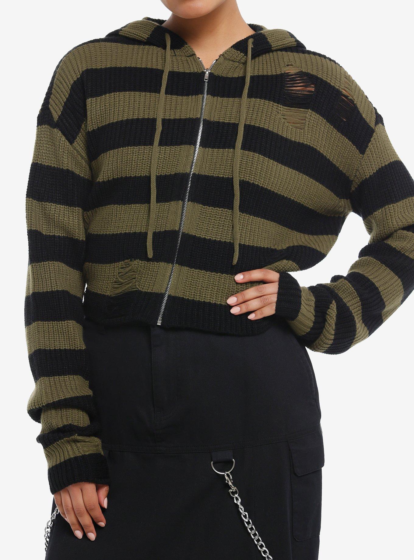 Update your hoodie collection! This knit cropped hoodie has black and army green stripes, with distressed details and a boxy fit.