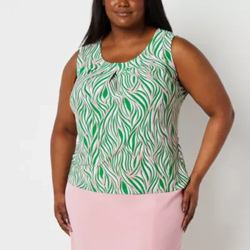 Designed with a green and pink abstract print, this sheath-like blouse from Black Label by Evan-Picone women's plus collection is made from a comfortable stretch fabric for a comfortable fit. This sleeveless top has a crew neckline and is cut for a regular-fit�style with a skirt or jeans.