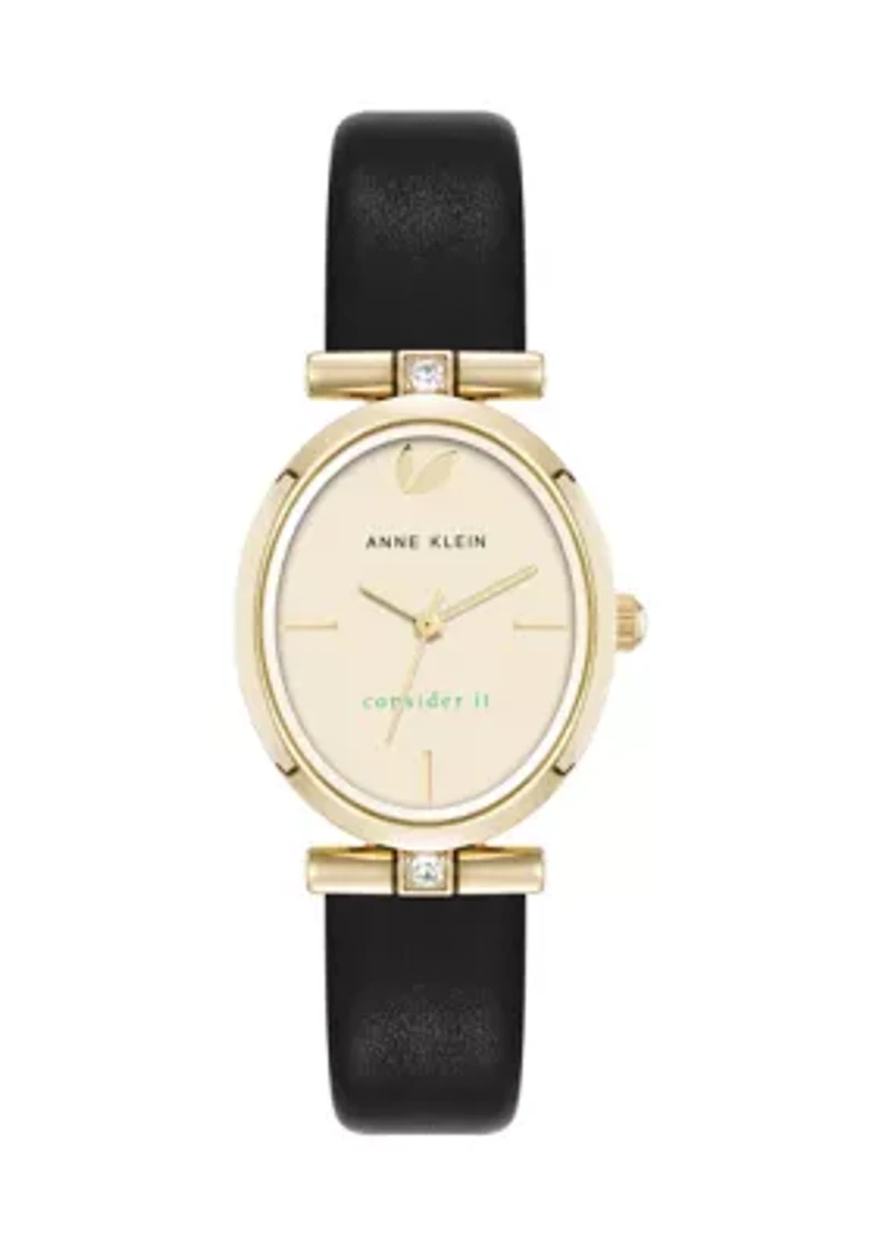 Make both a style and environmental impact with this sustainable leather strap watch from Anne Klein. The band is crafted from responsibly-made leather sourced from the Leather Working Group. This group is a member-led nonprofit organization dedicated to minimizing the environmental impact of leather production. Buckle closure Analog dial Imported Material & Care Gold-tone metal Clean with a soft cloth