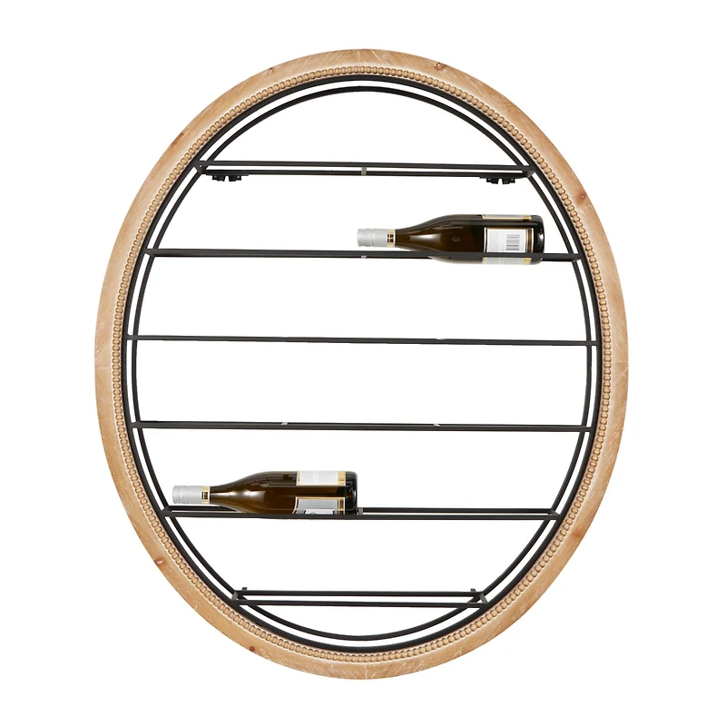 Infuse your home with cozy charm, where weathered textures, rustic finishes, and warm earthy tones create a wholesome atmosphere. Crafted from a combination of iron, resin, and MDF materials, this stylish and sturdy wine bottle holder is designed for wall mounting. The oval wall wine rack showcases a matte black metal finish for the bottle holders, paired with a whitewashed brown wood frame. This farmhouse-style wine rack accommodates up to 13 bottles, making it a functional statement piece with beaded details that add texture and visual interest. Measuring 39L x 3.5W x 39H inches and weighing 9 lbs, this 13-bottle wall wine rack is perfect for hanging in your kitchen or dining room above a cabinet, styled with glasses and bar accessories. It ships fully assembled in one piece and arrives in 1 carton. The rack can be hung vertically using the sawtooths on the back; nails and screws are not included. Suitable for indoor use only. Maximum weight limit is 50 lbs. This is a single black-colored wall-mounted wine holder in farmhouse style.Details:Black39" x 3.5" x 39" Weight 50 lbsIron, resin, MDFFarmhouse StyleWine rack accommodates up to 13 bottlesSuitable for indoor use