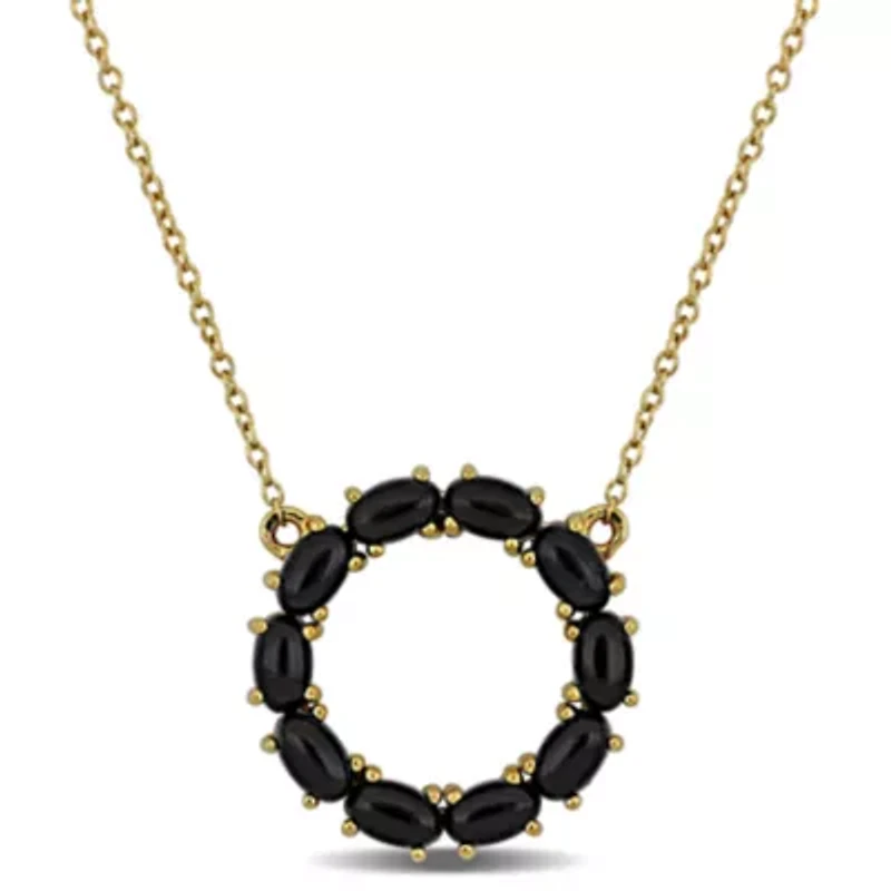 Make a bold and modern statement with this striking circle necklace. Featuring a sleek black onyx centerpiece, it creates a captivating contrast that feels both powerful and refined. The circular design symbolizes unity and wholeness, adding a meaningful touch to its contemporary style. Crafted in yellow-plated sterling silver, it offers a warm and polished finish that enhances its elegance. A versatile piece that embodies confidence, balance, and timeless sophistication. Spring ring clasp Polished finish Prong setting Warranty available, 60 days Thailand Imported Product Specifications 20" Material & Care Sterling Silver Metal, Sterling silver Clean with a soft cloth.