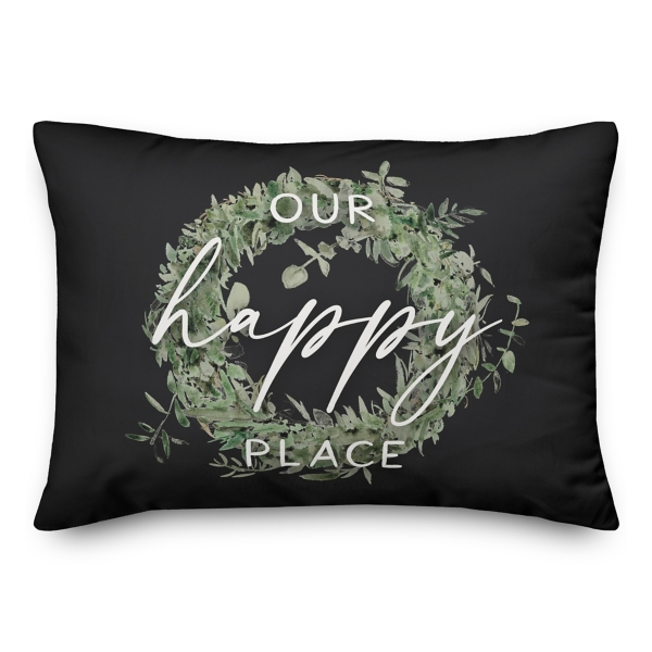 Make your house cozy inside or out with our Black Our Happy Place Indoor/Outdoor Lumbar Pillow! This pillow is perfect for your front porch or back patio to bring a sweet, charming touch to your space! Pillow measures 20L x 14H in. Crafted of polyester with polyfill Features a wreath and reads, "Our happy place" Hues of black, green, and white Solid reverse Designed and printed in the USA Safe for covered porch use Care: Spot clean only. Stain, mildew, and water resistant. This item is available at Kirklands.com only, not available in stores. Please note: this item cannot be shipped to APO/FPO addresses.