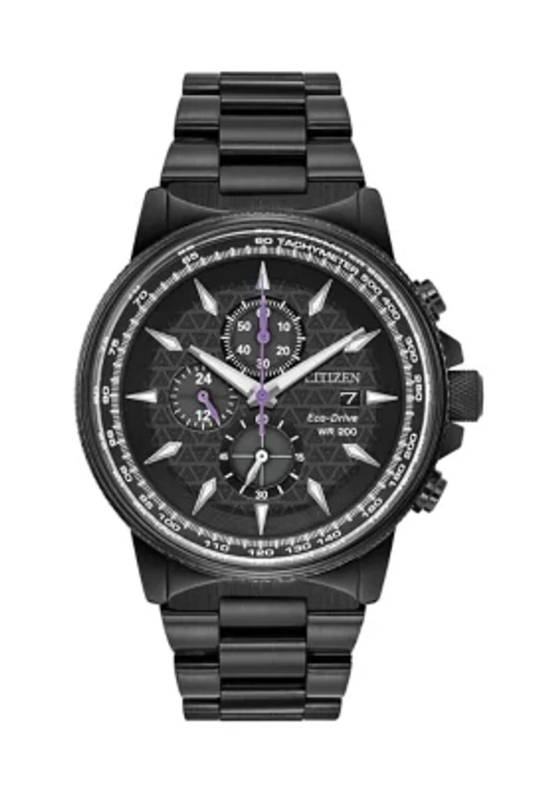 Channel your inner warrior with the powerful styling of the brand new Marvel Black Panther timepiece by Citizen, with Wakandan inspired tribal patterns and sharp silver-tone indices. Highlighted with violet accents, this timepiece features a case with black ion-plated stainless steel with black chroma finishing, a black ion-plated stainless steel bracelet, a black tribal print dial, and date. Featuring Citizen's Eco-Drive technology – powered by light, any light. Never needs a battery. ©2019 MARVEL Fold over safety clasp Chronograph dial Quartz movement Polished finish 5-year limited warranty Imported Product Specifications 42.4 mm round case Material & Care Stainless steel Spot clean