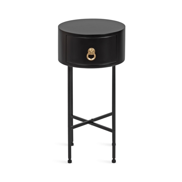 Embrace the stylish, functional design and modern finish of this Black Round Decklyn Accent Table! This lovely accent table is handcrafted from a resilient wooden material, giving you a timeless accent that is perfect for storage and display. Accent table measures 24H x 14 in. in diameter Crafted of metal and MDF Satin black finish Gold hardware finish Features a round shape Includes one (1) drawer Weight capacity: 50 lbs.; weighs 7.7 lbs. Minimal assembly required Not intended for commercial use Care: Dust with a soft, dry cloth./Spot clean only. This item is available at Kirklands.com only, not available in stores. Please note: this item cannot be shipped to APO/FPO addresses. WARNING: Cancer and Reproductive Harm - For more information go to www.P65Warnings.ca.gov .