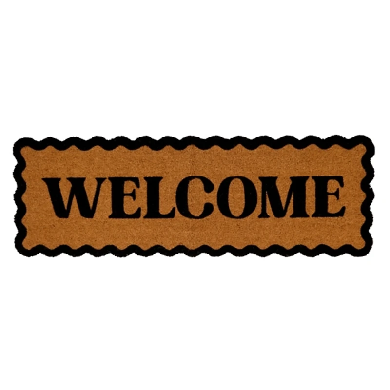 Accent your porch or entryway with this Black Scalloped Welcome Coir Doormat! Its bold lettering and eye-catching trim are perfect for making a stylish statement when greeting guests. Doormat measures 48L x 16W in. Crafted of coir with rubber backing Natural tan background finish Features the word "welcome" Scalloped black trim Care: Shake mat regularly to minimize dirt build-up. To prolong the life of mat, use in dry sheltered area. Avoid the mat from getting wet. Natural coir when wet may discolor surrounding areas. Contact your local Kirkland's store for availability. Quantities and selection may vary by location.