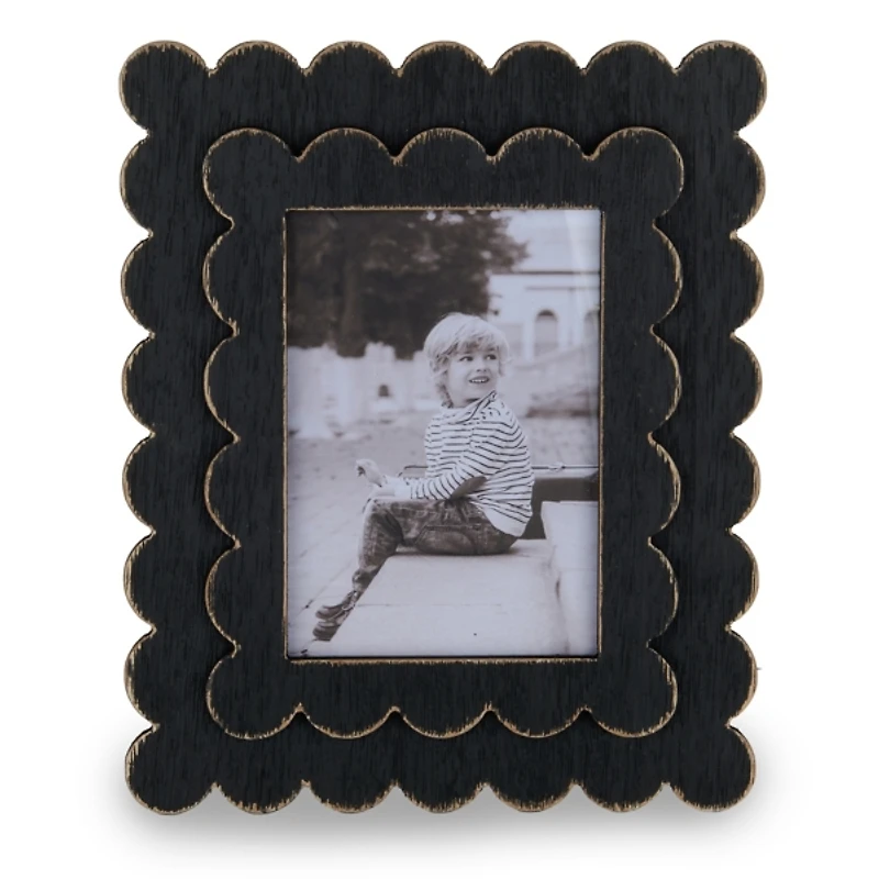 Give your favorite photo a lovely home with this Black Scalloped Wood Picture Frame. Featuring a layered frame with scalloped trim, it adds a refined texture to any space! Frame measures 9.25L x 0.63W x 11.25H in. Crafted of wood Black finish Double scalloped frame design Holds one (1) 5x7 photo Easel back for tabletop display Care: Dust with a soft, dry cloth. Contact your local Kirkland's store for availability. Quantities and selection may vary by location. WARNING: Cancer and Reproductive Harm - For more information go to www.P65Warnings.ca.gov .