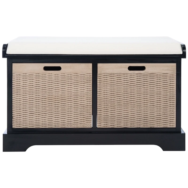 This Black Upholstered Lanie 2-Drawer Storage Bench performs double duty as a stylish storage solution and perfect seating in an entryway or mudroom. This bench gives your décor a touch of farmhouse charm with its distressed black finish and two spacious basket drawers! Bench measures 32.3W x 15D x 19H in. Crafted of wood and MDF Black finish Upholstered in white fabric and filled with high-density foam Features two (2) woven basket drawers Drawers measure 13.3W x 9.8D x 11.1H in. Weight: 35 lbs. Weight capacity: 180 lbs. No assembly required Not intended for commercial use Care: Spot clean. This item is available at Kirklands.com only, not available in stores. Please note: this item cannot be shipped to APO/FPO addresses.