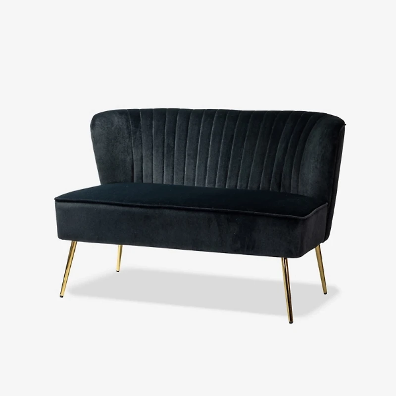 Add a touch of luxury to your space with this Black Velvet Monica Loveseat! Wrapped in rich velvet, this loveseat is perfect for small apartments, cozy nooks, or bedroom sitting areas. Loveseat measures 45W x 30.5D x 31.5H in. Crafted with a solid wood frame and metal legs Upholstered in black velvet polyester and filled with high-density foam Gold metal leg finish Features vertical channel tufting Angled tapered legs Seat measures 45W x 20.5D x 18H in. Weight: 43 lbs. Weight capacity: 500 lbs. Estimated assembly time: 10 min. Not intended for commercial use Care: Spot clean. This item is available at Kirklands.com only, not available in stores. Please note: this item cannot be shipped to APO/FPO addresses.
