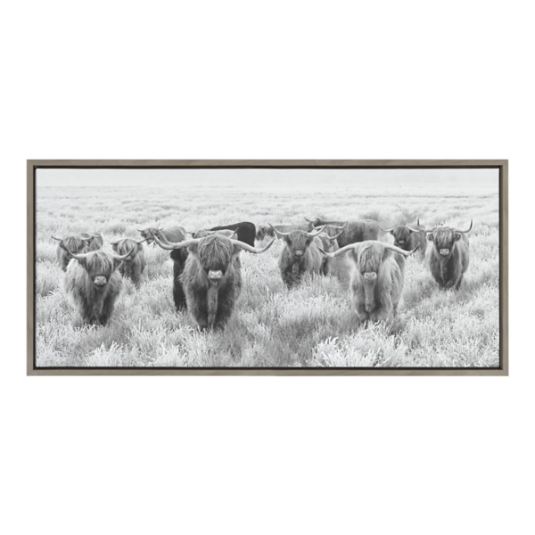 Bring rustic beauty to your farmhouse decor with our majestic Black & White Highland Herd Canvas Art Print. This art print is perfect for your entryway, above your mantel, or in your dining area for a natural look! Print measures 40L x 1.6W x 18H in. Printed with UV-resistant inks on linen texture canvas Wrapped in a polystyrene frame Gray frame finish Features a herd of Highland cows Hues of black and ivory Weight: 5.3 lbs. Printed and hand-framed in Waunakee, Wisconsin Hangs from back-mounted hardware Care: Dust with a soft, dry cloth. This item is available at Kirklands.com only, not available in stores. Please note: this item cannot be shipped to APO/FPO addresses. WARNING: Cancer and Reproductive Harm - For more information go to www.P65Warnings.ca.gov .