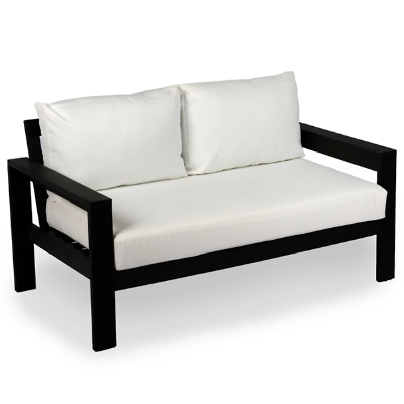 Upgrade your outdoor seating with this contemporary Black Wood Amalfi Outdoor Settee! Featuring a bold, clean-lined frame in a black finish and plush white cushions, this settee brings a modern aesthetic to patios, decks, and garden spaces. Settee measures 54W x 30.3D x 27.5H in.; seat height: 17 in. with cushion Crafted of acacia wood Black finish White cushions Features wide armrests Weight: 48.4 lbs. Weight capacity: 500 lbs. Assembly required Safe for outdoor use Care: Wipe with a soft, dry cloth. Contact your local Kirkland’s store for availability. Quantities and selection may vary by location.
