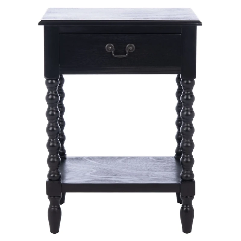 Classic farmhouse charm meets contemporary style in this Black Wood Phoebe End Table! This table's modernized ball-turned legs are beautifully highlighted by its bold black finish, while an open bottom shelf and slim drawer provide ample storage and display space. Table measures 19W x 15.8D x 26H in. Crafted of pine wood and MDF Black finish Features one (1) drawer and one (1) lower shelf Ball-turned legs Black drawer pull finish Drawer measures 12.5W x 9D x 3.5H in. Shelf measures 14.3W x 11.2D x 12.5H in. Weight: 17.6 lbs. Weight capacity: 40 lbs. Assembly required; see Info & Guides in the drop down below to view or print assembly info Not intended for commercial use Care: Wipe with a soft, dry cloth. This item is available at Kirklands.com only, not available in stores. Please note: this item cannot be shipped to APO/FPO addresses.