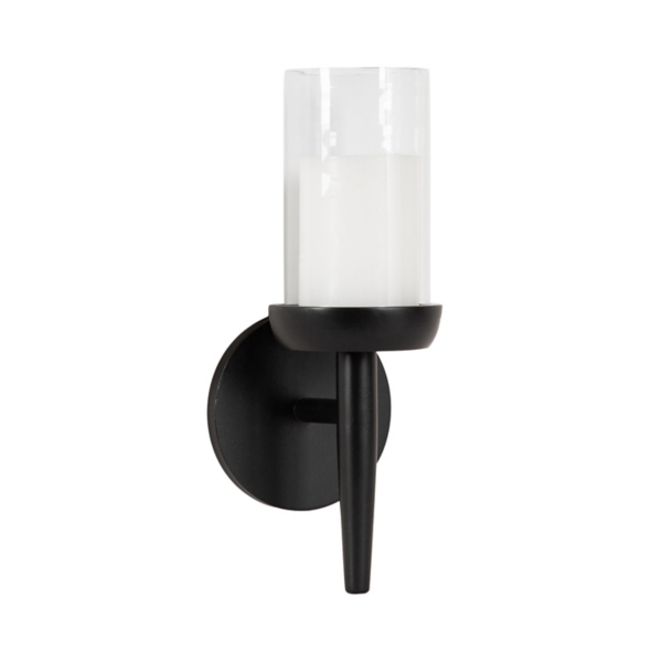 Enhance your living space with the rustic allure of the Black Wood Shay Wall Sconce. Artfully crafted from solid mango wood, this decorative sconce radiates timeless charm, adding character to any room. Sconce measures 5L x 5W x 13H in. Crafted of mango wood and glass Black finish Removable glass cylinder Torch style design Weight: 1 lbs. Accommodates one (1) standard pillar candle; candle sold separately Hangs from back keyhole hangers Care: Dust with a soft, dry cloth. This item is available at Kirklands.com only, not available in stores. Please note: this item cannot be shipped to APO/FPO addresses. WARNING: Cancer and Reproductive Harm - For more information go to www.P65Warnings.ca.gov .