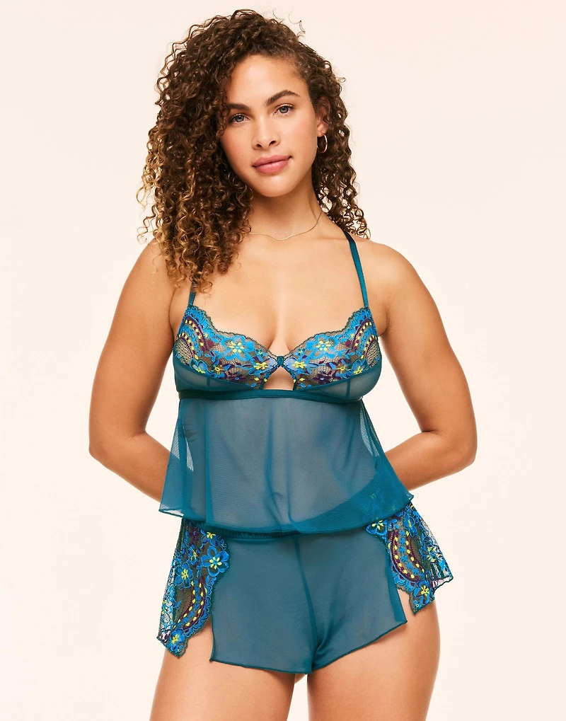 Get ready to unwind in our Blake Floral Blue Camisole and Short set. This lingerie set is made with pretty printed lace, front adjustable straps, and matching shorts. (Available in sizes XS-XL.)