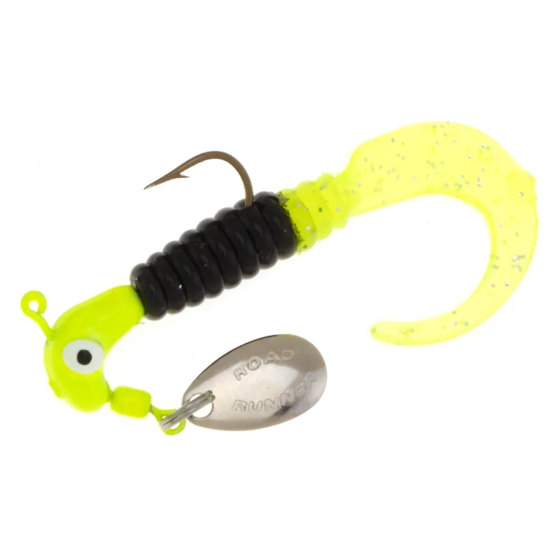 Draw the attention of bluegill and brim with the Blakemore Road Runner® 1/16 oz. Curly-Tail Jigs 2-Pack. These prerigged jigs feature underspin blades for flash, vibration and easy hookups. The curly tail is constructed from soft plastic for an added rippling effect.